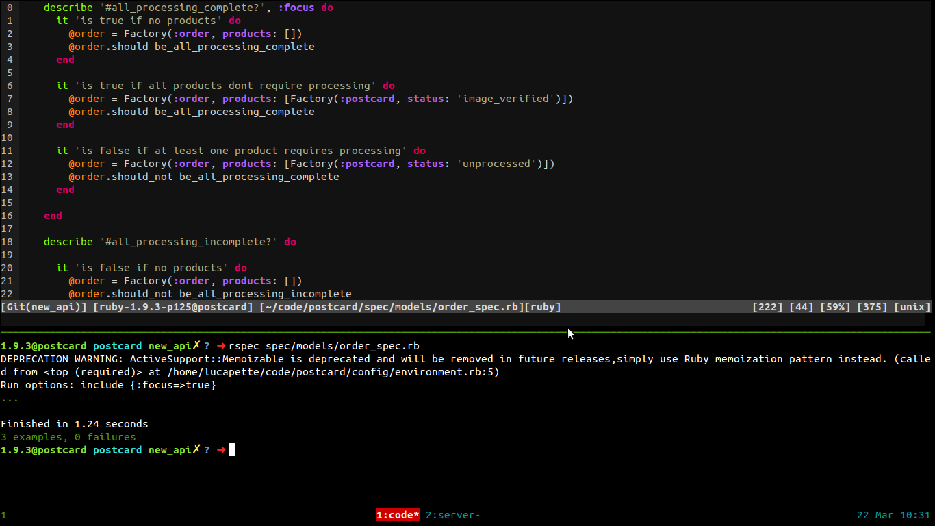 Yes, re-reading the post I had the feeling I ended up talking about Rails specific stuff less than I thought while I was going to write it. But, I can understand why: tmux isn't specific to Rails, of course. It just fits very well with my personal habits. Furthermore, one of the most important thing I'm (still) learning living our profession is giving new stuff a try when I have the chance. Especially, when a lot of people are already trying or using the same stuff. So, give tmux a try if you're using the console all the time. I bet most of you will really like it.