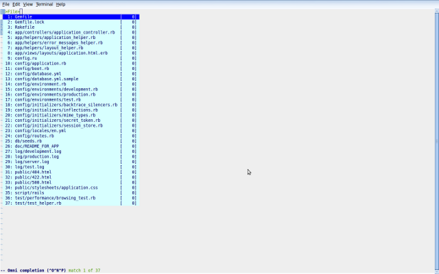 So you have just solved your problem with directories without leaving vim. Now you have to face other tiny problems that occur while editing Rails projects. Fairly often I run into a small problem that really annoys me: I don’t remember the exact name of the file I need to read/edit or where exactly it is stored. This situation can be a problem, imagine the use case: "How on earth did I call that lib?" "Where the hell is that wtf.rb?" - you could waist a minute or two every time you run into this problem. Obviously, there are a lot of solutions to this problem and the best one, in my opinion, is the FuzzyFinder with the improvements of FuzzyFileFinderTextMate by another true hero Jamis Buck. I am also a Java Developer (don’t give me away) and the only thing I miss (I swear it’s the only one) is the ctrl-shift-r that you can find either in Eclipse or in Netbeans. Practically, the Find-Resource is a very nice feature you can use when you want to find a file “project scoped”. This functionality is fairly famous in the Rails eco-system because of TextMate “cmd-T” feature, and the fame is well-deserved. I mean once you start using it you will never stop. However this plugin has a tiny but annoying problem. By default, FuzzyFileFinder use the current directory "." as root directory for performing searches. When you want to open a file being in a sub-directory of your Rails project, say ‘app/model/’, you start searching for it but FuzzyFileFinder won’t be able to find it if your file is not placed in ‘app/model’. In such a situation you lose all the power of FuzzyFileFinder. You have at least two ways to solve this problem. The first one uses a function made available by rails.vim:
